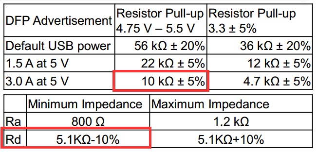 CC線:是用于與E-Marker芯片通信的線,兩頭都有連接,并且根據產品種類接Rp或Rd,更低配置的線是沒有E-Marker芯片的,Rp和Rd可以根據下表設定,一般用紅線內的值。