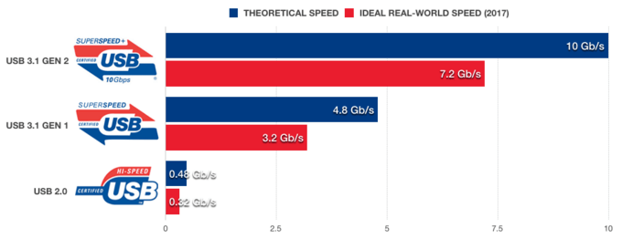 USB 3.1推出的三年后,USB 3.22017年正式被提出,相比USB 3.1數(shù)據(jù)傳輸速度又翻了倍,達到了20Gbps,比傳統(tǒng)的HDMI 1.4接口還要更快,連接4K級別的顯示器完全綽綽有余,而成倍的提升完全依靠USB Type-C中增加兩組數(shù)據(jù)傳輸引腳,在USB 3.2上這兩組引腳才得到了真正的發(fā)揮。而搭載USB 3.2的設(shè)備也將于2019年正式與我們見面。